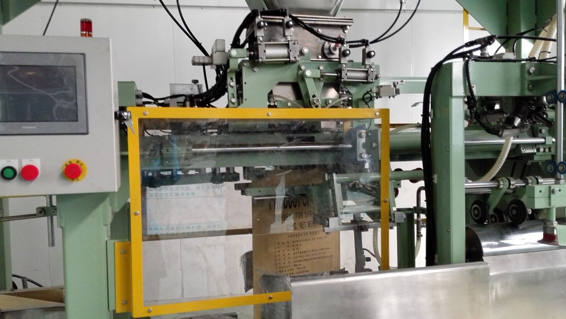 At this time, the system checks whether the bag clamping device In the predetermined state, when the packaging bag has been clamped, the system sends a control signal to open the unloading door of the weighing bucket, and the material enters the packaging bag.