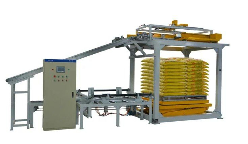 The palletizer stacks contained materials (in cartons, wove bags, barrels, etc.) or packaged/unpackaged regular-shape items on the (wooden) pallet according to a certain arrangement automatically. After stacking several layers, the full pallet will be conveyed out for further packing or to the warehouse by a forklift. It is suitable for the stacking of bags and boxes of staggered arrangement in after-packaging process.
