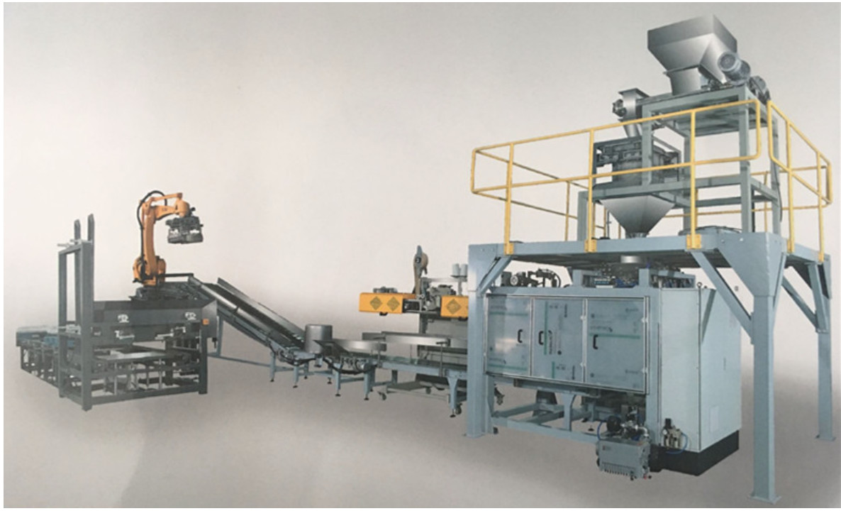 Automatic giving empty bag - automatic weighing - automatic filling - automatic sewing machine - automatic conveying -automatic robot palletizing stacking;
